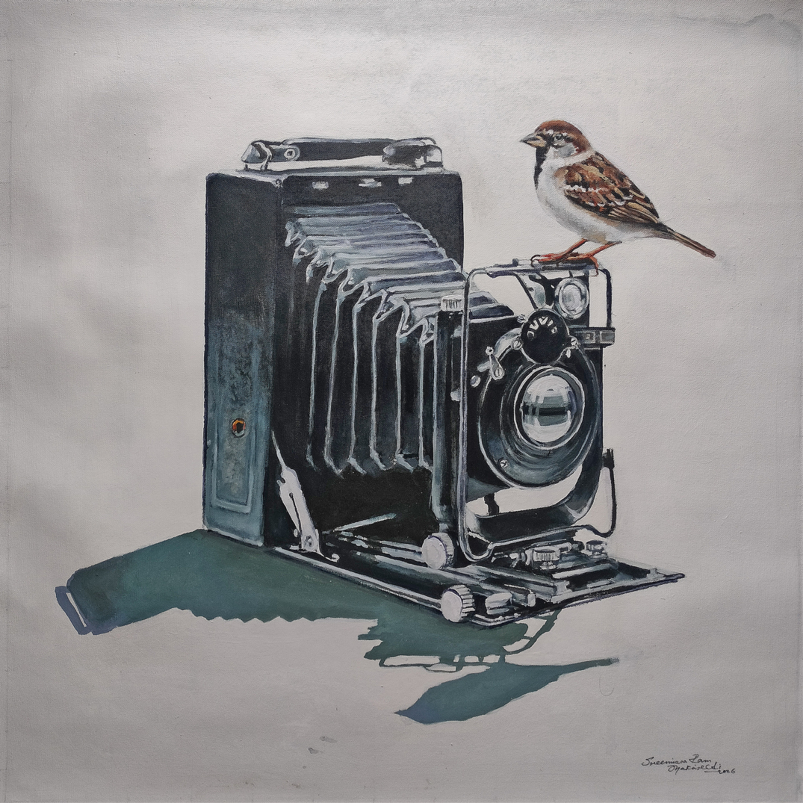 In “Focus,” acclaimed artist Mr. Shrinivasa presents a stunning juxtaposition of the mechanical and the organic. This acrylic on canvas work centers on a classic vintage folding camera, rendered with such precision that the textures of the leather bellows and the gleam of the lens feel almost tangible. The sudden presence of a lifelike sparrow perched atop the device breathes life into the cold metal, suggesting a theme of patience and the “decisive moment” celebrated in photography